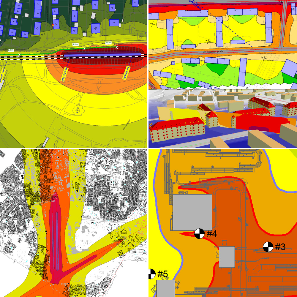 SoundPLAN 软件带有一套缺省计算标准,可以计算出当地的噪声情况,还可以输入实地考察数据,推算出更加精密的噪声数值,我们通过这些噪声影响数据,规划交通管制,制定合适的项目方案等等。